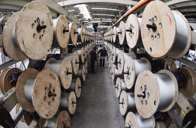 12月19日,工人在西安重装渭南橡胶制品有限公司钢丝绳芯输送带生产线上作业。